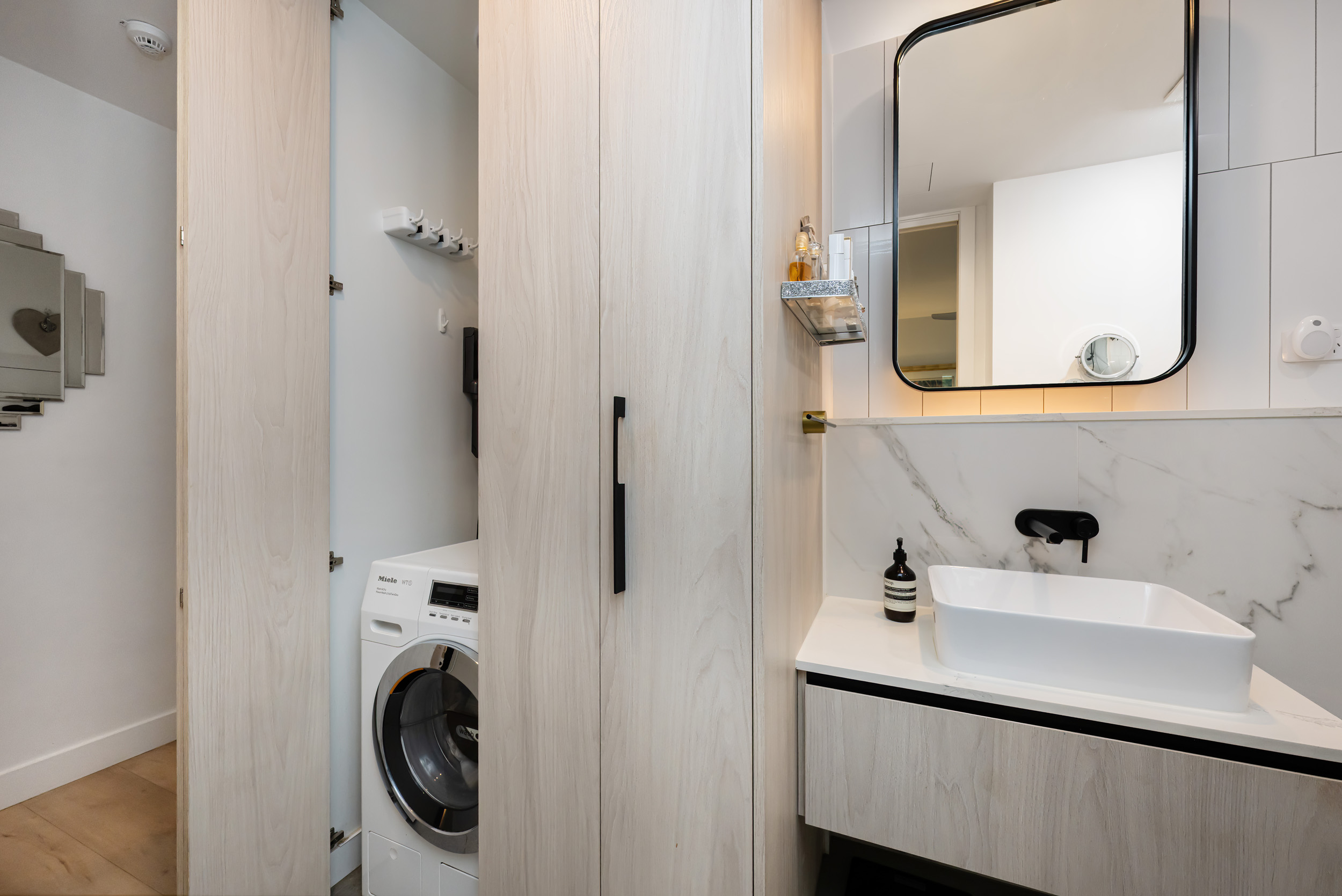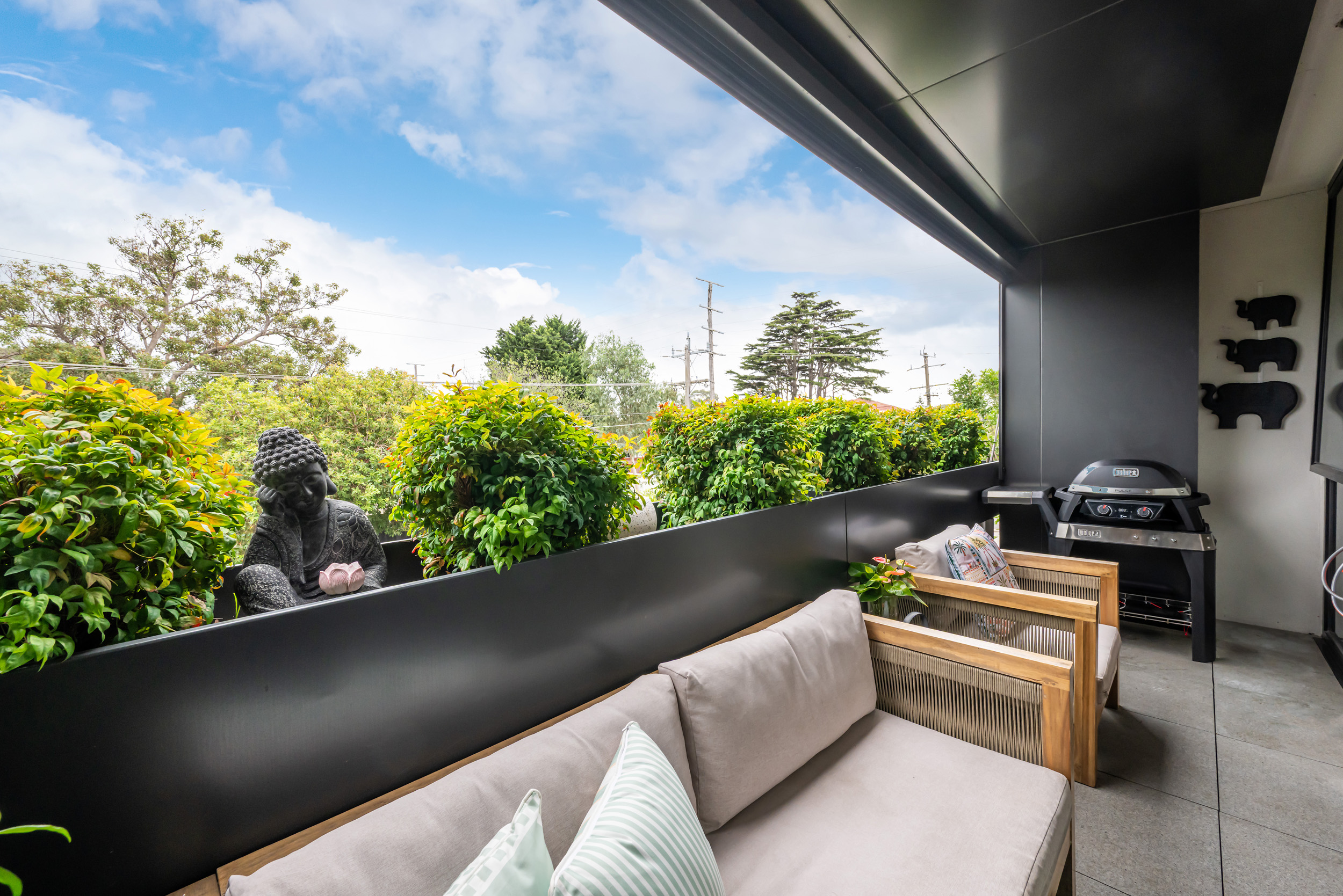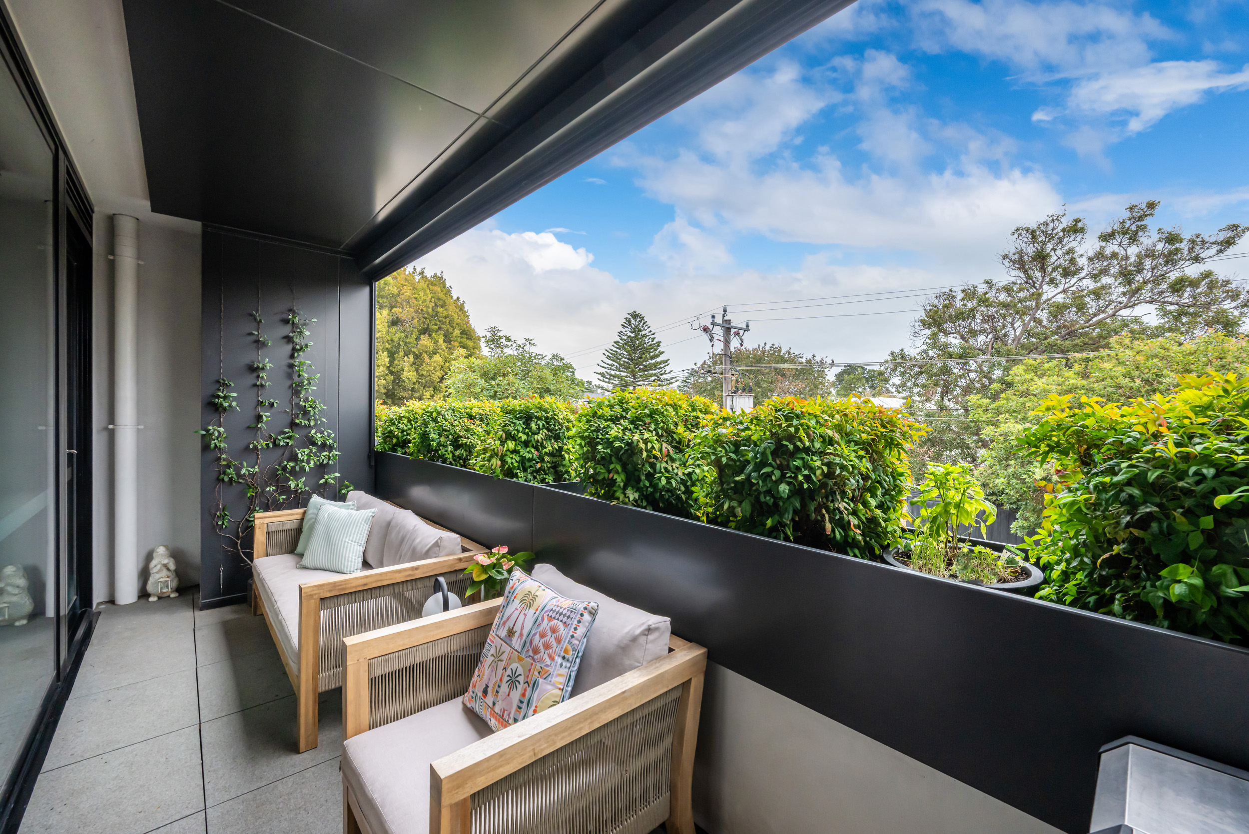 A standout feature is the versatile balcony, an intimate outdoor space enhanced by a retractable roller blind, allowing it to be fully or partially enclosed. This clever design transforms the area into a usable extension of the living zone, perfect for enjoying in all seasons.