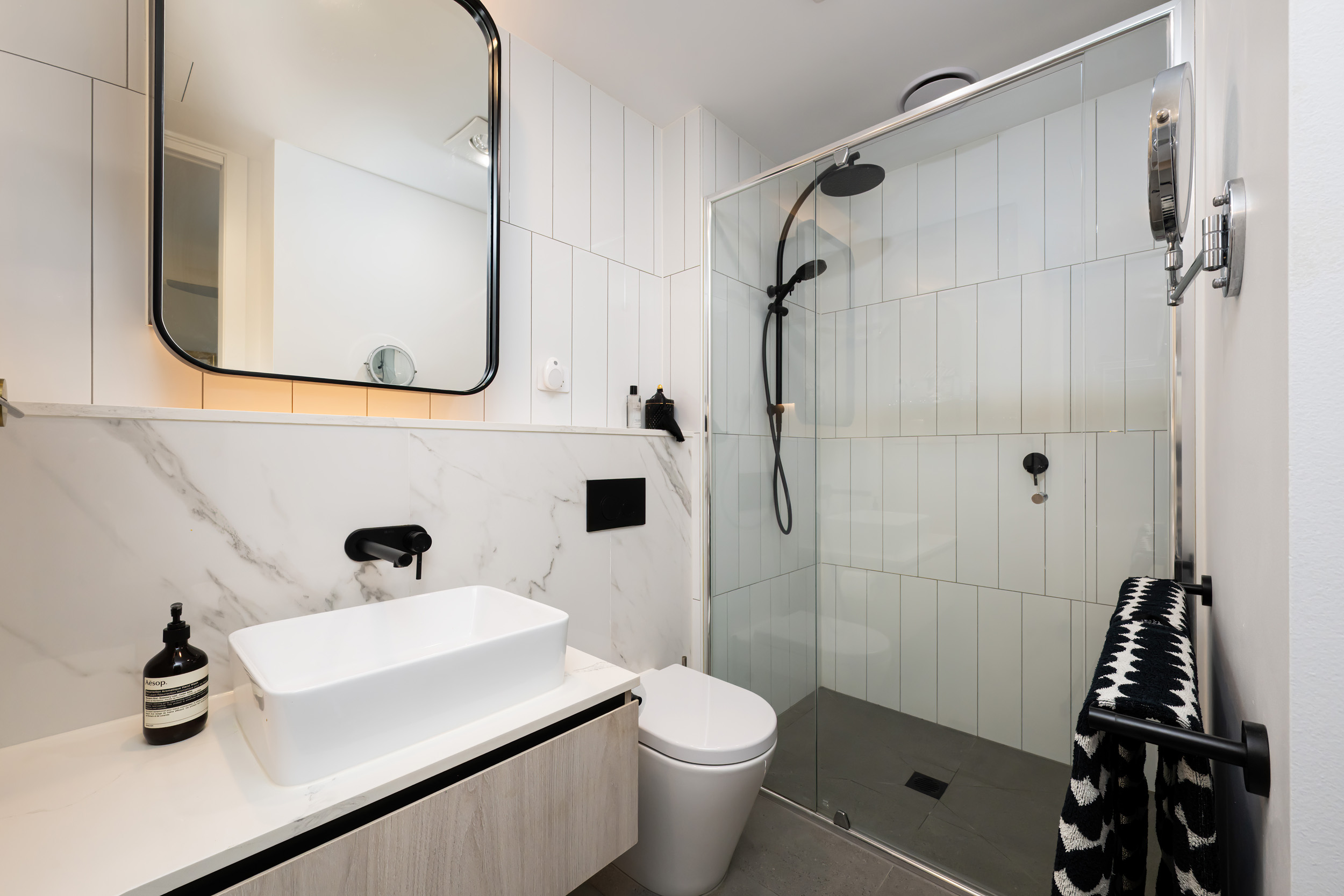 The accommodation comprises a well-proportioned bedroom with mirrored built-in robes, serviced by a sophisticated, fully-tiled bathroom. Additional features include matte black tapware, split system heating and air conditioning, a secure basement one car space and a storage cage.
