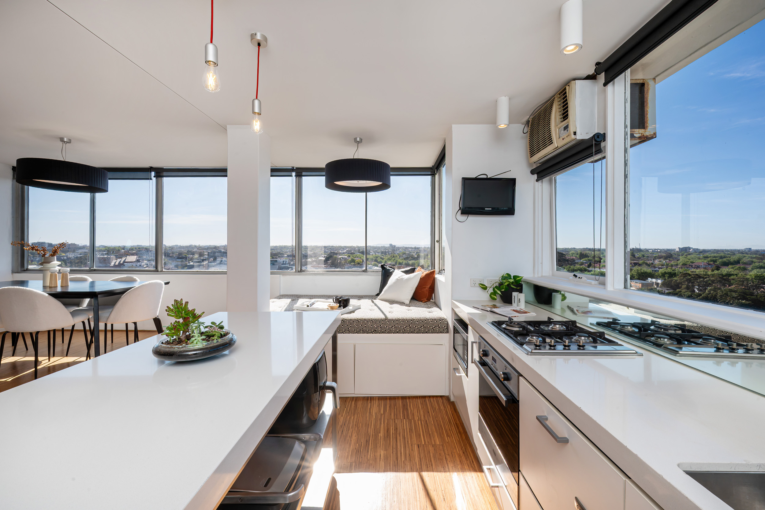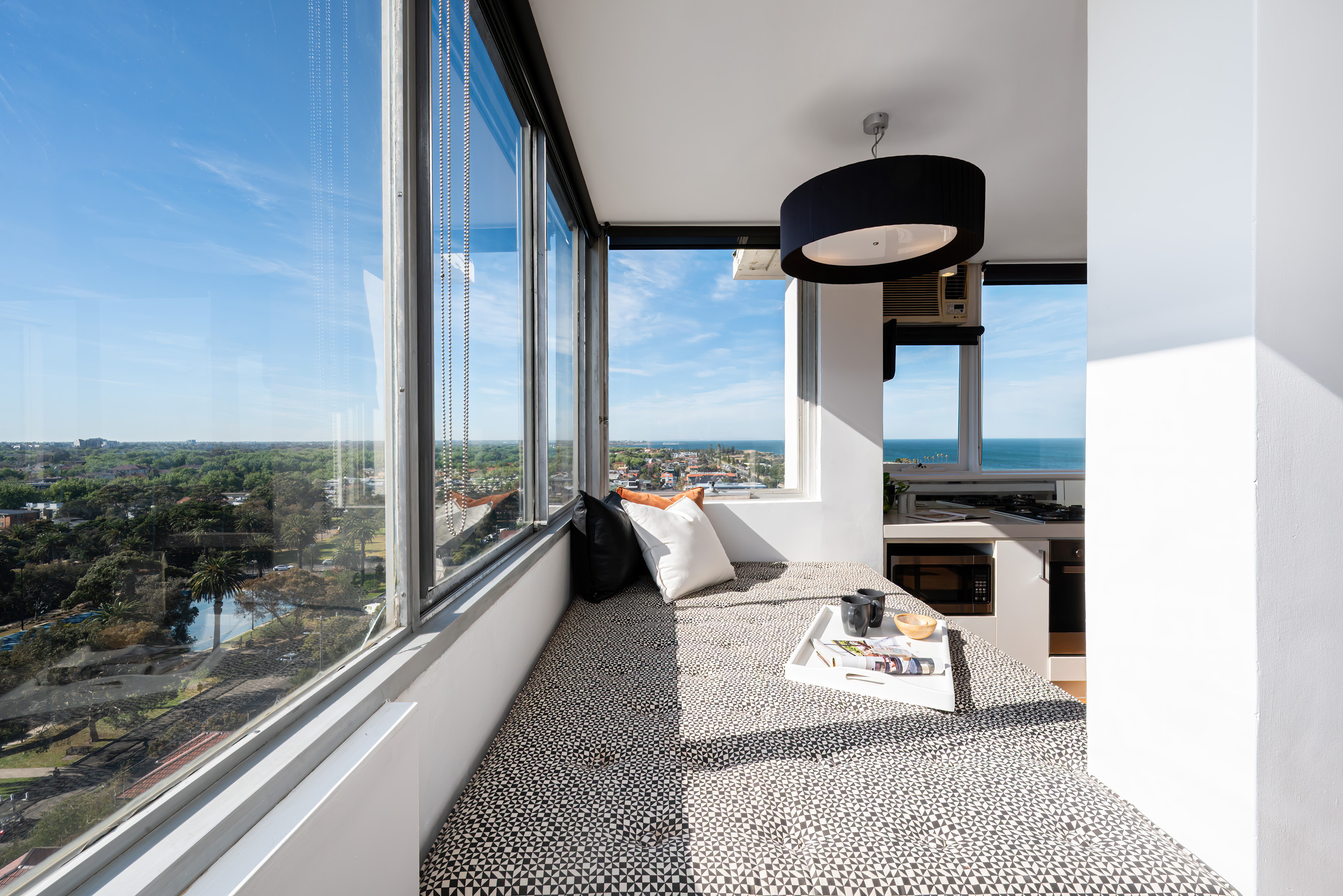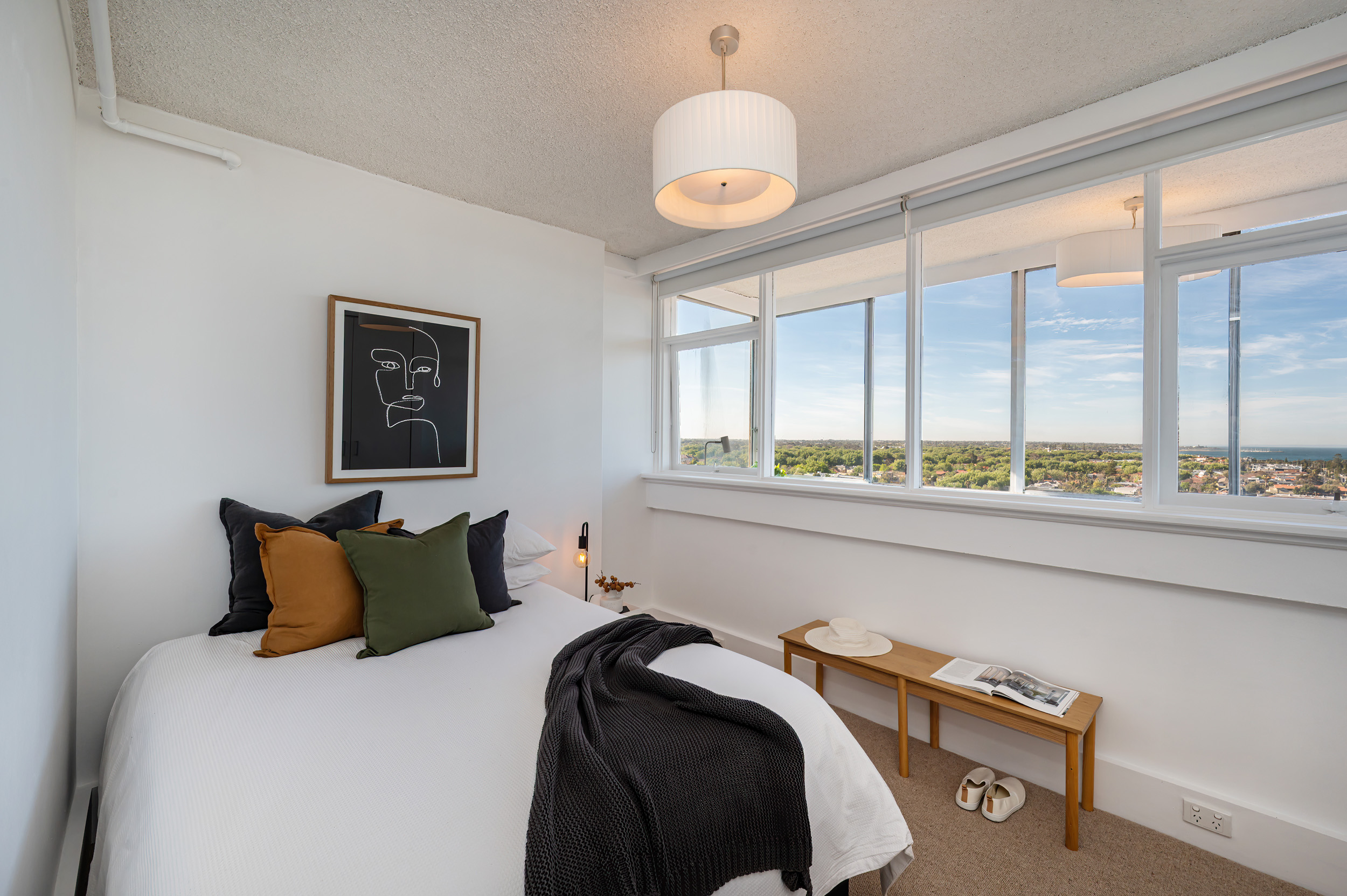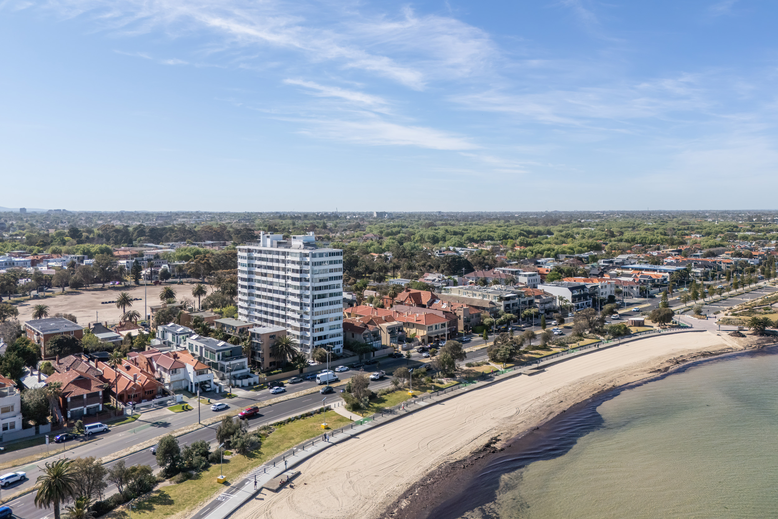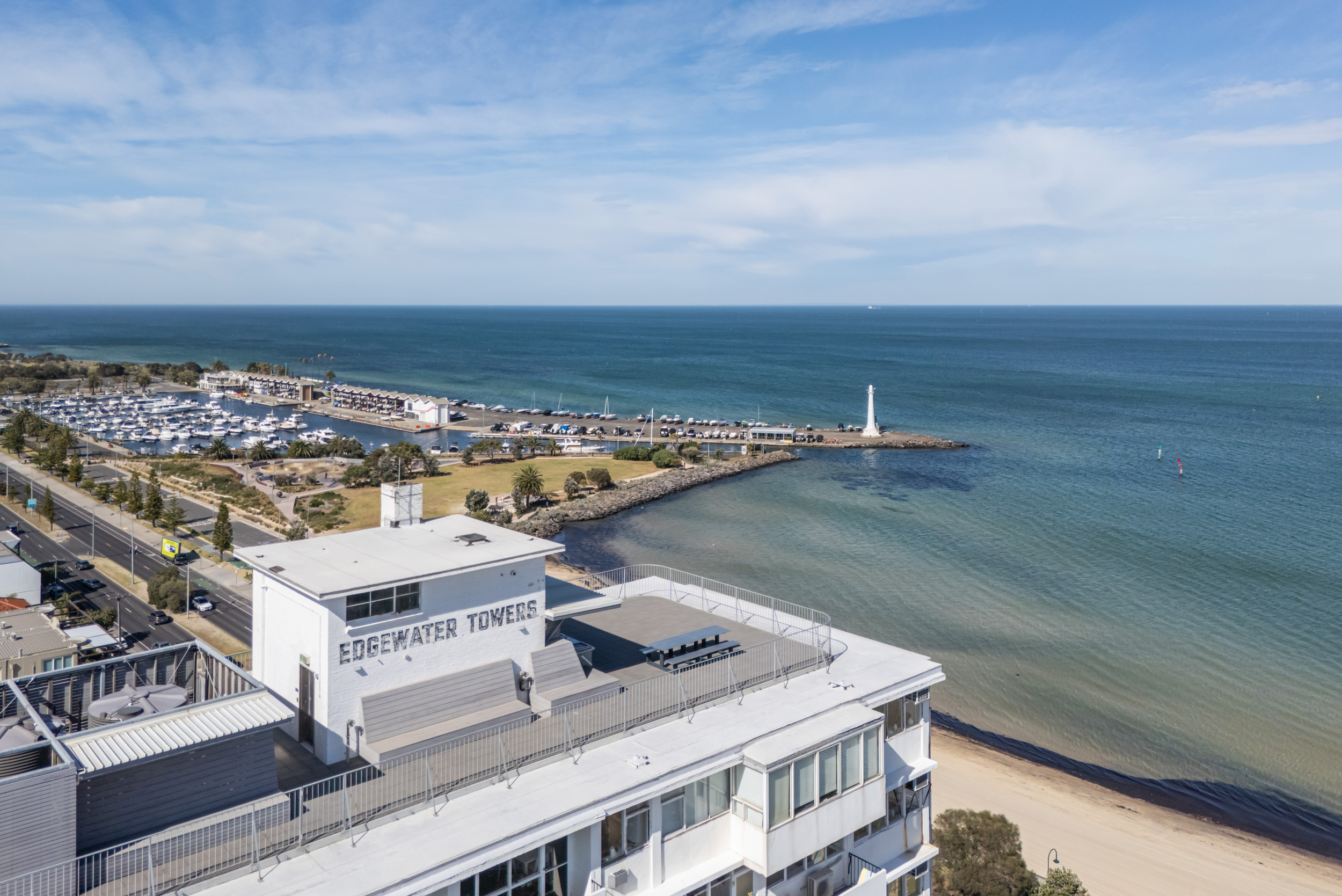 Imagine waking up every morning at the water’s edge — welcome to 12G/12 Marine Parade, St Kilda, a penthouse apartment nestled in the iconic Edgewater Towers. Built in the early 1960s and designed by celebrated architect Mordechai Benshemesh, Edgewater Towers represents a striking piece of Melbourne’s architectural heritage, known for its clean lines, white facades, and coastal modernism.